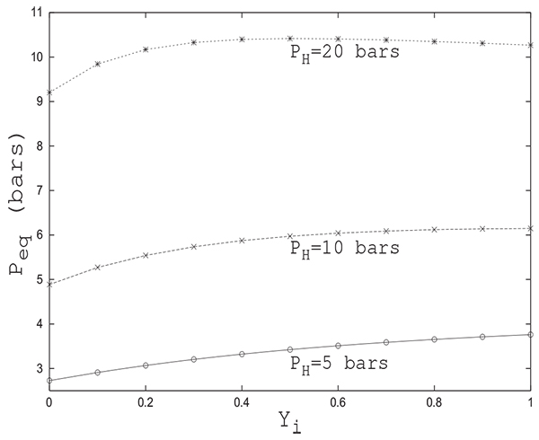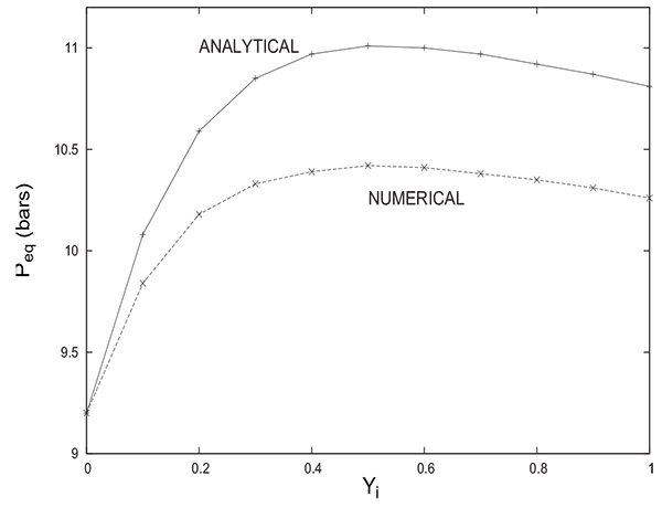 It is interesting to note that both solutions provide the same trend of evolution of Peq with Yi. In both cases, the equilibrium pressure increases initially with Yi to attain a maximum value and then begins a slight decrease. The difference between the two solutions does not exceed 0.5 bar despite the rough approximations considered for the analytical solution. The value of Peq given by the analytical solution is always greater than the one given by the numerical solution. For Yi = 0 (the column contains only an inert gas), note the coincidence of the numerical value of Peq with that obtained analytically (from equations 17 or 18). One can often resort to comparison between numerical and analytical solutions in special cases to prove the reliability of modelling and numerical resolution. It is the case herein.