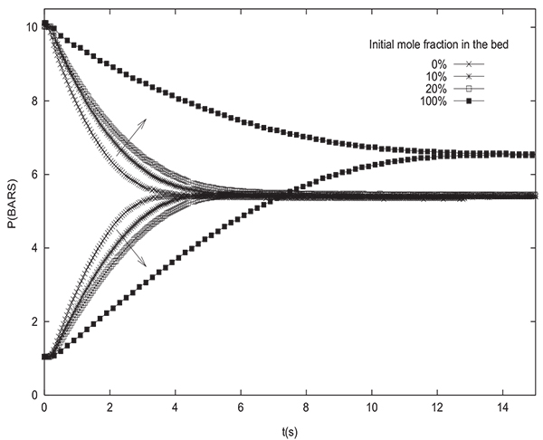 The arrow indicates direction of increasing initial methane molar fraction in the column. The end of the equalization step is obtained when the pressures in the bed and the tank become equal. It can be seen that the equalization time teq, corresponding to obtaining the same pressure in the column and the tank, increases with CH4 molar fraction. The highest and lowest values of teq are obtained for columns which have been initially in equilibrium with pure methane and pure H2 respectively. The experimental value of Peq obtained when connecting a column initially saturated with pure CH4 with the tank is Peq =6.56 bars, this value is not far from Peq =6.47 bars given by simulation, but very far from Peq =4.88 bars if equation (17) is used.