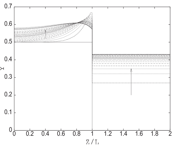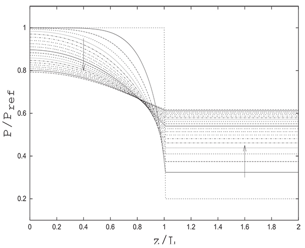 In what follows, we will consider a fully saturated column at a high pressure PH and a tank at a low pressure PL containing only inert (pure product). The volume of the tank is equal to that of the column. Fig. (5) gives the evolution of the pressure in the column and the tank during time. The pressure in the tank, as mentioned previously, is uniform. X-coordinates (z/L) varying from 0.0 to 1.0 correspond to the column, and x-coordinates from 1.0 to 2.0 are relative to the tank. This does not mean that the tank has the same length as the column.This representation is chosen to show both the pressure variation in the column and the tank, since the numerical solution gives only a single pressure value in the tank and not a longitudinal profile.