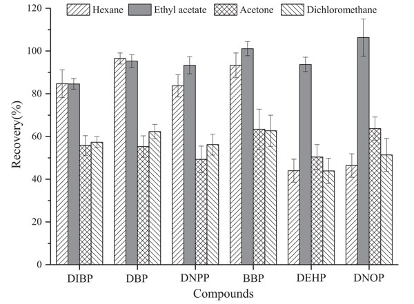 Obtained recovery rates are indicated in Fig. (3). Results show significant differences among the elution effects by four solvents. Acetone and dichloromethane show the poorest effects (with all recovery rates of six substances less than 65%). Hexane presents good elution effects on DIBP, DBP, DNPP, and BBP, but its DEHP and DNOP recovery rates are less than 50%. Ethyl acetate as elution solvent yields the highest recovery rates (84% to 106%) and better repeatability (RSD≤8.4%). Probably because ethyl acetate and phthalate esters both contain ester group, ethyl acetate gives the highest recovery rates based on the principle of similar dissolution. Thus, 5 mL ethyl acetate is selected as the elution solvent in this method.