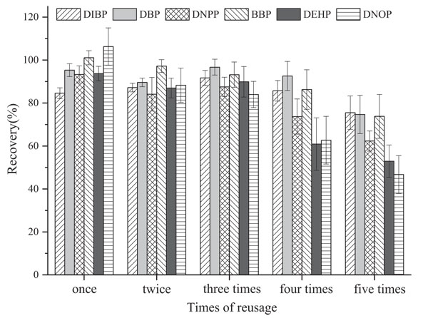 Manufacturers of SPE cartridges will generally stress that the product is disposable. In practice, however, people prefer SPE cartridges to be used for several times to save costs. The reuse of SPE cartridges strongly depends on the complexity of sample matrix solution. With a highly complicated matrix solution, the possibility of reuse of SPE cartridges is smaller. Through the experiment, we observe CB6 SPE cartridge recycling through repetitive operations (prewashed by 5 mL methanol → balanced by 5 mL water → passed through solution A → eluted by 5 mL ethyl acetate). We can see from Fig. (5) that the CB6 cartridge can guarantee that the recovery rate of each substance is higher than 80% after three reusage times. Then, the recovery rate starts to sharply decrease after the 4th use.