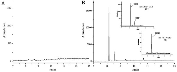 See Fig. (8) for chromatogram of blank matrix (practical samples not including plasticizers in the experiment of migration) and chromatogram of sample 4 after 24 h through migration.