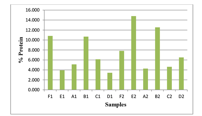 Results shown in Fig. (2) suggest that the pre-treatment seems to have suppressed the protein in the raw samples of F1 and F2, but upon drying, a higher percentage of protein is preserved in the treated sample than in the untreated one. However, the best protein content was recorded at E2 (air-dried sample) followed by B2 (sample dried at 50 °C). No particular trend was observed in all temperatures considered. Results obtained are similar to findings of Correia et al, 2008 [21] but much higher than protein present in Musa paradisiaca (Ekpete et al, 2013) [2]