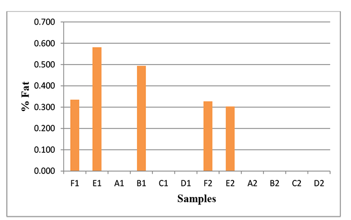 The fat content of both the treated and untreated fresh samples are the same. Unfortunately, no meaningful inference can be drawn from the Fig. (4), as the fat content in most of the samples could not be detected. This means that the fat content of bananas after drying is very small in amount.