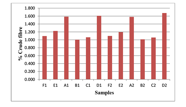 With the same level of crude fibres in both treated and untreated fresh samples, extreme temperatures considered, A1, A2 (dried at 40°C) and D1, D2 (dried at 70°C) seem to favour the retention of crude fibre in the dried samples as shown in Fig. (5).