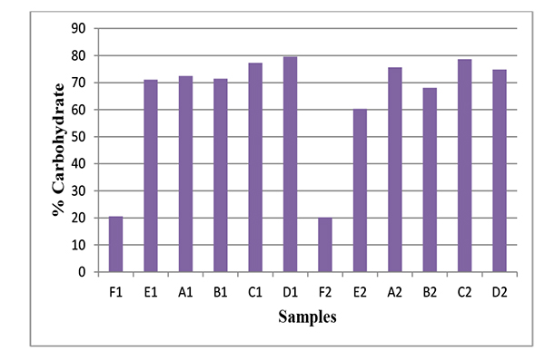 The carbohydrate content of the dried fruit is favoured by drying, as shown in Fig. (6). More sugars are present as more water is removed and also, as drying temperature is increased (D1, D2, E1, E2). This is in consonance with results obtained by Correia et al. (2008) [21] in dried chestnuts flours.