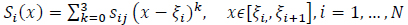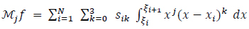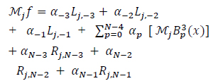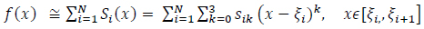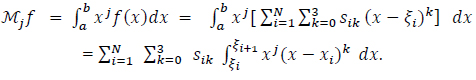 The unknown coefficients are the four coefficients of each spline, which is a total of 4N unknowns. A smoothness condition at the boundaries of the interval is assumed, which means that the function, its first and second derivatives, are null at the boundaries. This gives 2 × 3 equations. The continuity of the splines, their first and second derivatives at the nodes, provides 3(N − 1) equations. The remaining (N − 3) equations are supplemented from the moments by computing the moments of both sides of the equation (9):
