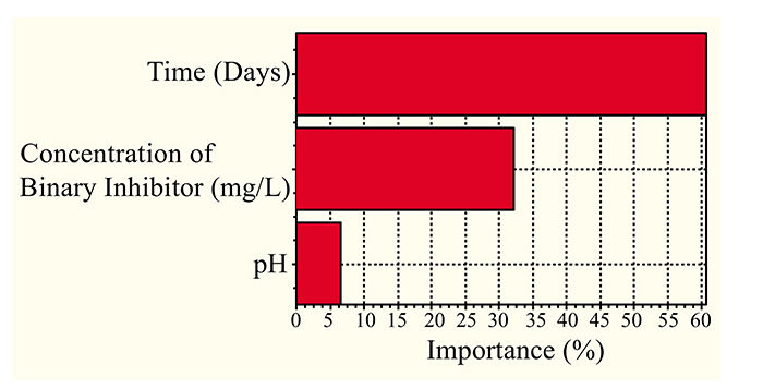 Overall, both the models prove that relative to the process parameters used, the importance level of the parameters was Time < Concentration of binary inhibitor < pH.
