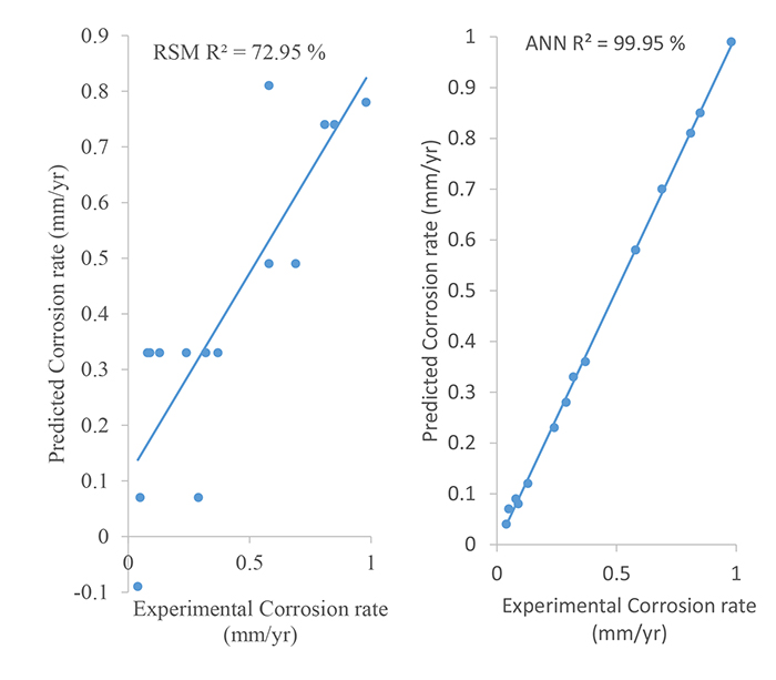 The determination coefficient (R2) by ANN was observed to be 99.95%; this was far greater than what was observed by the RSM model. This implies that a greater variation of 99.95% can be explained by the ANN model while a lesser variation of 72.95% can be explained by the RSM model. Also, the root mean square error (RMSE) observed by the ANN model was 0.0099 while the RMSE observed by the RSM model was 0.1871. Since a lesser RMSE shows the greater efficiency of a model in predicting the corrosion rate of mild steel occurring in crude oil solutions. Therefore, based on the R2 and RMSE values observed in this study with varying concentrations of the binary inhibitor, time and pH, ANN demonstrated a better efficiency than the RSM model in predicting the corrosion rate of mild steel in crude oil.