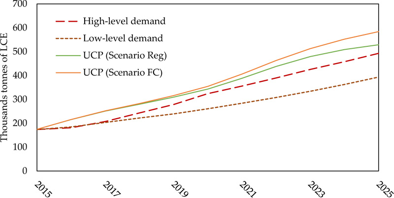 Fig. (10) presents the dynamics of the global supply and demand for lithium, according to Un-Committed Projects (UCP) scenarios. Both the low-level demand and the high-level demand are overpassed by both scenarios of UCP. The result shows that Reg scenario reaches around 529 thousand tonnes of LCE by 2025. It exceeds the low-level demand by 34% and the high-level demand by 7%. The FC scenario reaches around 584 thousand tonnes of LCE by 2025. This scenario exceeds the high-level demand by 18% and the low-level demand by 48%.