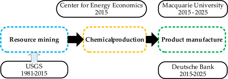 The collected data covers the period from 1981 to 2025 (Appendix, Table A1. The data is mainly from institutional reports, as shown in Fig. (2). In the resource mining stage, the historical data for the countries producing lithium are obtained from USGS for years 1981-2015 [17-39]. In the chemical production stage, the report of the Center for Energy and Economics provides information corresponding to the conversion from the resource mining stage to the product manufacturing stage in 2015 [40]. In the product manufacturing stage, two databases are used to show the estimated demand for lithium quantitatively until 2025; reports are provided by Macquarie University and Deutsche Bank [41].