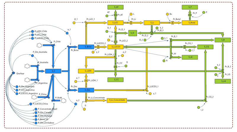 All variables and parameters nomenclature are given in Appendix, Table A1. Based on the system dynamics method, we developed a stock and flow model of the lithium flows. The model consists of three major segments, as shown in Fig. (1). The segments are marked by three colors: blue - resource mining stage, yellow - chemical production, green - product manufacturing as shown in Fig. (3). In the first stage, resource mining, the production in Chile, Argentina, Australia, China, Canada, Brazil, Portugal, Zimbabwe, Namibia, Russia, and the United States, is taken into account. In the second stage, chemical production corresponds to the processes of making butyl lithium, lithium metal, lithium chloride, lithium carbonate, lithium hydroxide, and lithium concentrate. Finally, the third stage includes products containing lithium, such as polymers, batteries, air treatment equipment, aluminum alloys, metal casting powders, ceramics and glasses, lubricant greases and others.