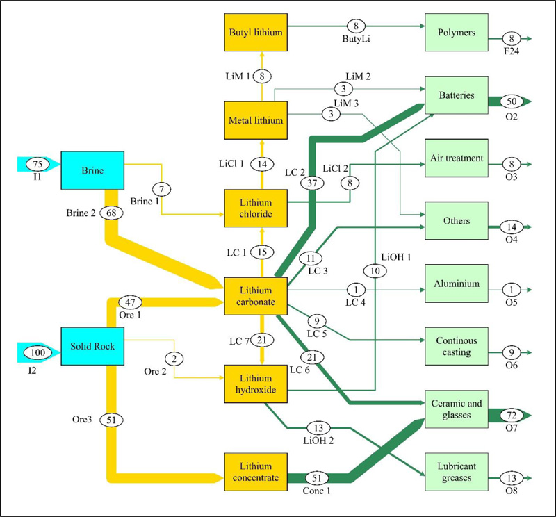 According to the databases used in this study, as shown in Fig. (1), the flows between resource mining, chemical production, and product manufacture are calculated as material flow. We present in Fig. (4) the material flow between lithium processing stages using the production data of the major producers in 2015, according to the report of the Center of Energy Economics [46].