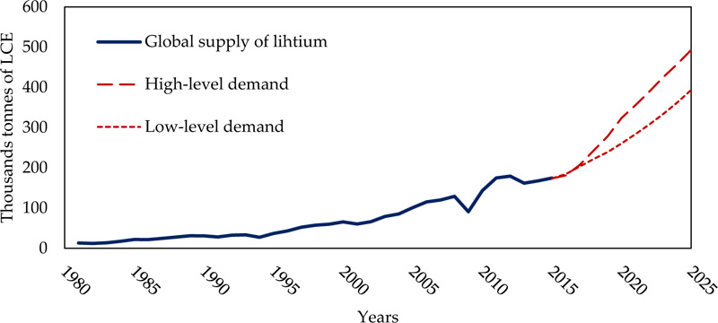 Considering the USGS database and the reports of Macquarie University and Deutsche Bank, Fig. (5) presents the historical global supply of lithium as well as the low and high-level demand for it. The high-level demand will reach around 493 thousand tonnes of LCE by 2025 with a CAGR of 11%, whereas the low-level demand for lithium will reach ca. 393 thousand tonnes of LCE by 2025 with a CAGR of 9%.