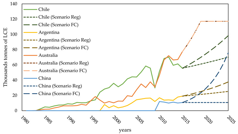 Two scenarios for the future growth rate of lithium production have been considered: regular growth rate (Reg scenario) and full capacity growth rate (FC scenario). Both are related to the increase in capacity. The regular growth scenario considers the increase in production until now, and will continue with the same annual growth rate, based on historical data. In this case, the capacity depends on the production growth rate. The full capacity growth scenario expects that the capacity of production of each country will reach 100% in 2025, unlike the previous scenario, in which the production growth rate depends on the production capacity.