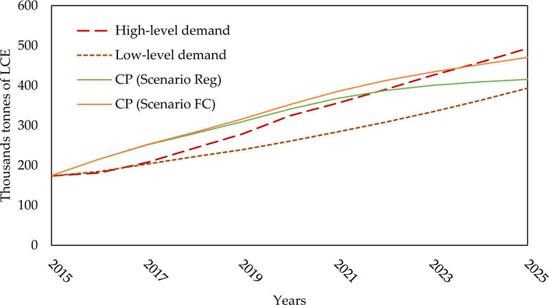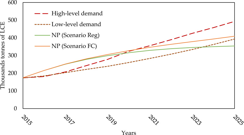 Fig. (8) shows the results of a comparison between supply and demand for NP scenarios. The low level-demand can be met in 2025 with the FC scenario but not with the Reg scenario. The Reg scenario reaches around 354 thousand tonnes of LCE covering 90% of the low-level demand. The high-level demand is not covered by any of the NP scenarios; Reg scenario reaches 72% of the high-level demand and FC scenario reaches 83% of the high-level demand, respectively. These results indicate that even with a full capacity production, the demand still overpasses the possible supply, and therefore, new projects are required.