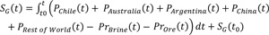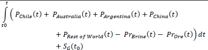 Where the primary production of lithium by Chile (PChile(t)), Australia (PAustralia(t)), Argentina (PArgentina(t)), China (PChina(t)) and other countries including Brazil, Canada, Portugal, the US, and Zimbabwe (PRest of World(t)) is considered. Two processes including brine processing (PrBrine(t)) and ore processing (PrOre(t)) are assumed as the main chemical processes in this step. SG(tO) is the initial stock of the global supply of lithium.