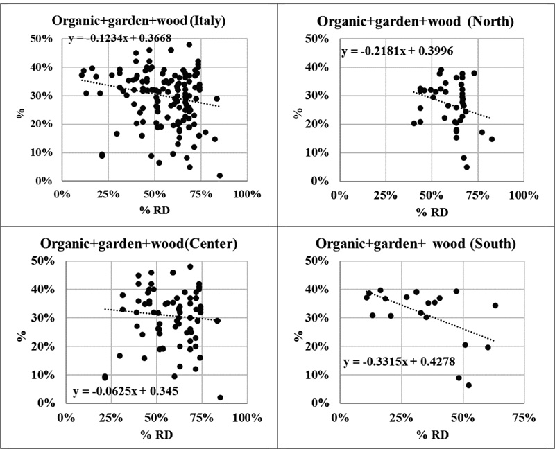 In general, it should be considered that the waste fractions that are more actively sorted by customers tend to reduce their presence in mixed waste and separate collection efficiency increases. This concept is known as “interception”. The selected, normally recyclable, waste fraction is “intercepted”, sorted and sent for recycling/processing. The higher the interception, the greater the slope of the regression line. On the contrary, if a waste fraction is not actively sorted or if it not destined to sorting as, in most of the collection systems (i.e., diapers and hygienic pads), the tendency is towards an increase of the presence in the mixed waste with an increasing separate collection efficiency. The intercept of the regression line estimates the amount of the selected waste fraction in the absence of separate collection. The sum of organic, garden waste and wood is the most abundant waste fraction in Italy, representing 37% of total waste as these fractions, at the household level, are collected together in Italy with a 0% separate collection.