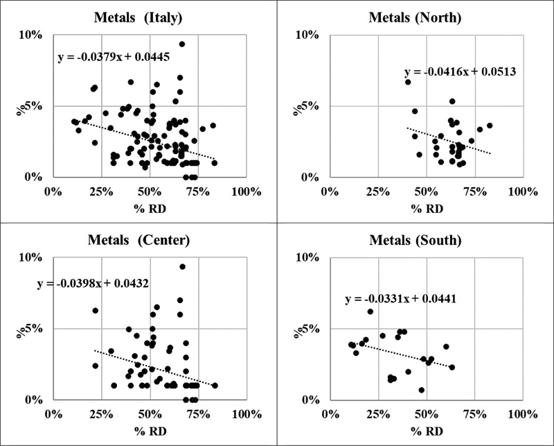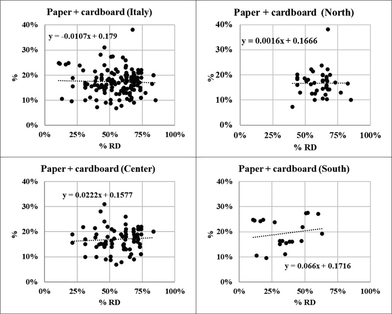 In order to verify general tendency, a linear regression model has been used (Fig. 1). On a National level, the composition of mixed waste at 0, 25, 50 and 75% separate collection efficiency has been generated by linear regression for the most predominant fractions (i.e., organic + garden waste + wood, paper + cardboard, metals, plastic, textiles, glass, diapers + sanitary pads, and “other waste” (remaining portion).