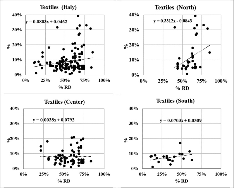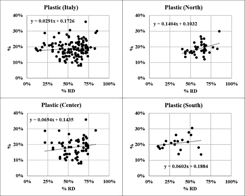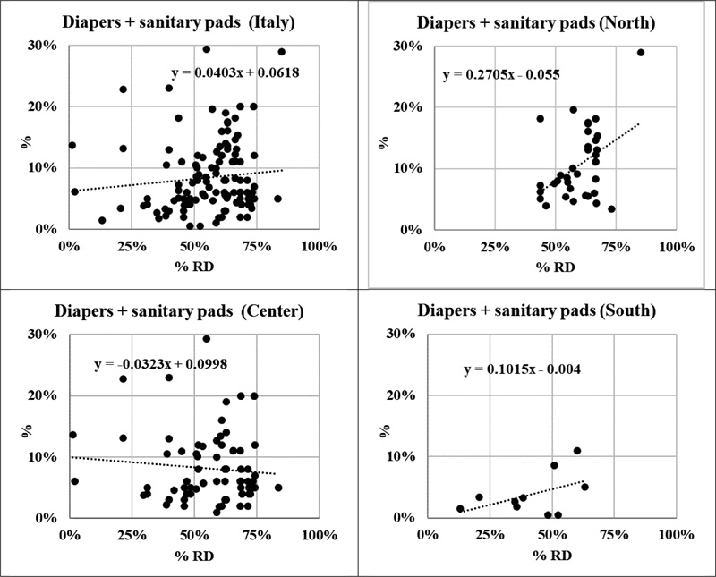 Diapers and sanitary pads (Fig. 4) are normally not destined for recycling. The first smart plants, which could recover about 75 kg of plastic, 75 kg of super absorbent polymer, SAP, and up to 150 kg of cellulose from 1 ton of adsorbent products, has been only recently opened in Lovadina di Spresiano, province of Treviso, by FaterSMART company [24] and therefore their presence in mixed waste should decrease with increasing separate collection efficiency. This is confirmed by data at the National level for two of the three macro-regions. The tendency for Center is quite unexpected, but it is not considered significant. The presence of diapers and sanitary pads can be estimated in the 5-10% of mixed waste, with some outliers in the higher side between 20 and 30%.