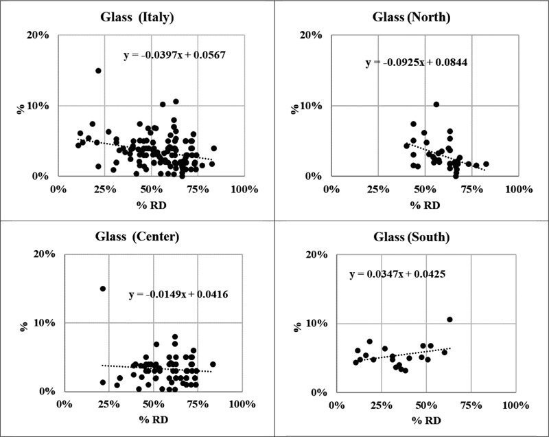 With the exception of an outlier that impacts the interpretation of the glass (Fig. 5) data for the South macro-region, it is clear that glass is actively sorted and that its presence in residual waste is scarce (in the order of 3-5% in most cases).