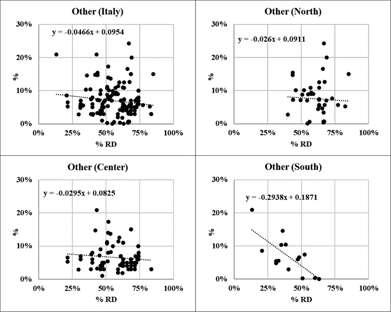 The significant decrease in highly efficient separate collection systems (Fig. 1) verifies that the selection of organics by customers is active, especially in the North and in the South areas. Some outlier values are present. A possible explanation is the implementation of policies for household composting and the traditional use of kitchen waste for animal feeding in rural areas. A reduction in the waste management fee is normally given to households that use this practice.