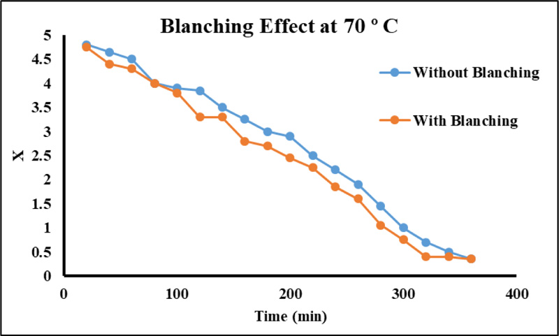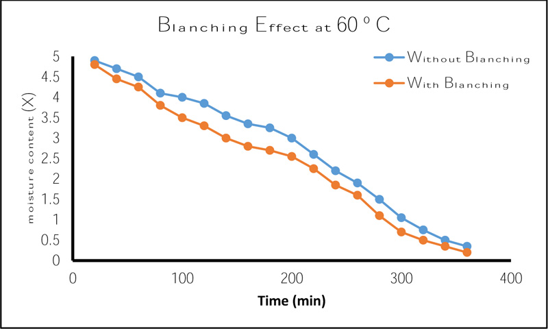 Blanching is a dehydrating process where the material is heated up for some specific high temperature for a few seconds or minutes to reduce the moisture content of material for further drying operation. Similar procedure was followed in the experimental work where banana samples were blanched in hot water for 0.5 to 3 minutes before performing the drying operation in natural draft try dryer. Experiments were performed on different varieties of banana at different time and temperature with and without blanching operation. It was observed that the drying time of the banana is reduced sequentially with an increase in the blanching time. This is due to the convective heat transfer that takes place, where normally drying time is less and resistance film is not at all formed on the material containing starch. Unblanched banana does not show any significant effect in terms of colour, appearance and drying time. Figs. (1 and 2) show the above discussed phenomena in a graphical form. (Refer supplementary data file).