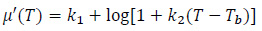 where k3 = 0.002 K -1, k4 = -0.19. The coefficients of Eq.s (12) and (13) are found fitting the data shown in Fig. (1) at page 296 of the work by Fanti et al. [14], using the non-linear least square routine of Matlab (The MathWorks Inc., Natick, MA, USA). The µ'(T) and µ'' (T) curves for the magnetic hydroxyapatite scaffold with properties from Tab. 3.2 are presented in Fig. (3).