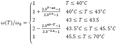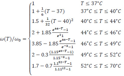 For the tumour tissue, the relative temperature variation is rather different and can be evaluated using the following piecewise model [17, 18]: