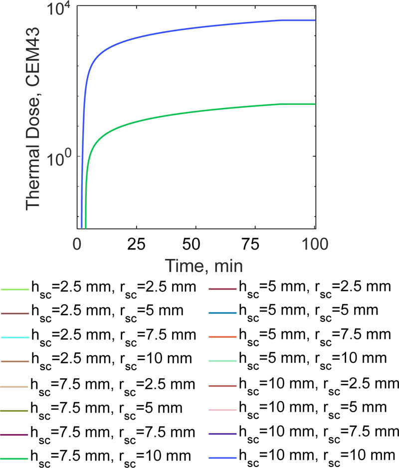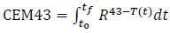 Besides the average temperature in a tissue, a clinically relevant figure of merit is the CEM43, i.e. the thermal dose, for a given time, necessary to produce damage which is equivalent to the damage which could be procured by exposing the tumour tissue at 43 °C for 60 min [33]:
