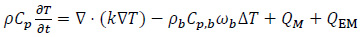 This last scenario coincides with the non-physiological conditions which are induced for therapeutic purposes during the hyperthermia treatment [5-8, 10, 14, 17, 18]. For the case of HT using magnetic implants, the dynamic and spatial evolution of the temperature distribution, in both the target and the non-target tissues, can be measured by calculating the power which is transmitted during the RF exposure. The presence of an external EM field forcing the system can be included in Eq. (1) as follows: