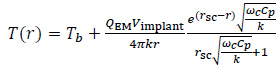 From a theoretical point of view, the exact and closed-form solution of the partial differential equation (Eq. (2)) is not trivial [19]. However, under some assumptions and simplifications, the thermal field can be found. In particular, the case of a cylindrical implant with a spherical cross-section, with radius r sc and volume Vimplant, was investigated [10]. The tumour tissue was assumed to be a spherical and homogeneous region surrounding the implant. By neglecting QM, assuming ρ, C p and k to be constants, and considering the final temperature increase as the final outcome of the HT, Eq. (2) can be solved using the steady-state limit to obtain the following radial