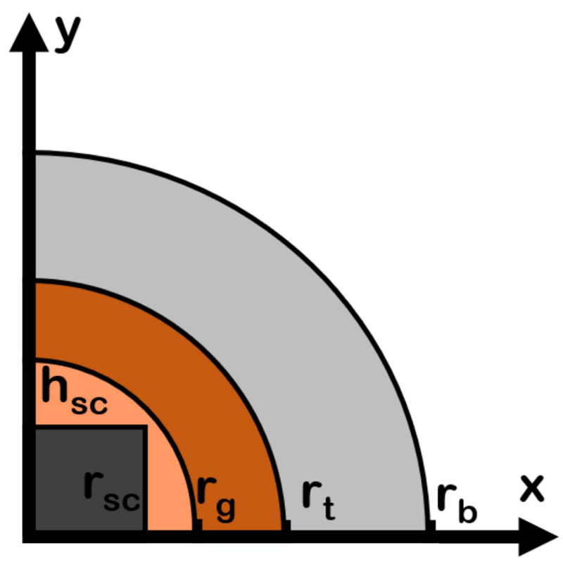 The geometry presented in Fig. (2), given the spatial symmetry reason, is a fourth of the entire domain, and only the first is considered to lower the computational burden due to the coupled and non-linear nature of the multiphysics problem. The proposed geometry is different from those of the cited literature, since the previous works considered a simple circular scaffold with a fixed dimension r sc = 5 mm [14-17]. The investigation of an implant with a cylindrical shape is a rather critical point for practical applications [2, 4]. However, in the literature, the influence of the geometrical parameters of the implant on the hyperthermia treatment is often neglected or poorly investigated, being [10] the only one, and not recent, exception.