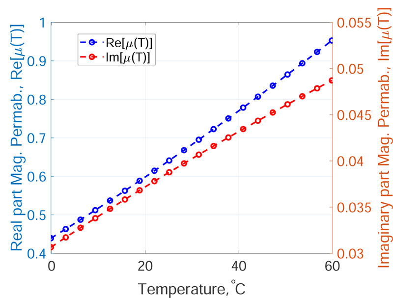 where k1 = 0.3 and k2 = 0.0129 °C -1. For the imaginary (out-of-phase) part of the magnetic permeability, the variation with respect to T can be assumed to be linear, i.e.