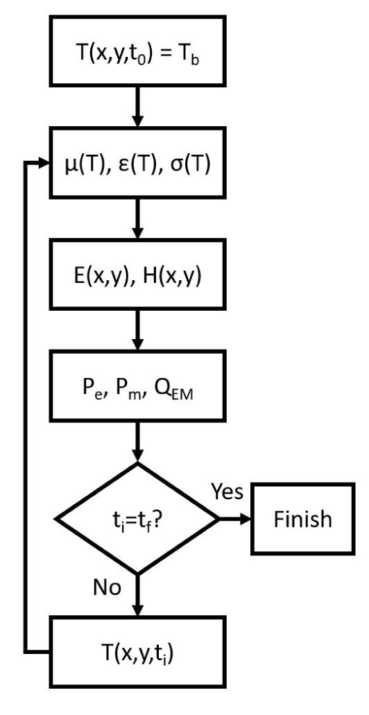 Assuming a homogeneous initial temperature distribution, the magnetic properties of the implant and tissues were evaluated by using Eq.s (12) and (13). Then Maxwell’s equations were solved in the frequency domain using the AC/DC module [17, 34]. The power which is stored and dissipated by the magnetic implant was derived by using Eq.s (9), whilst the dielectric losses were computed using Eq. (8). The overall electromagnetic power QEM was obtained according to Eq. (3). After the evaluation of the thermal properties at the current temperature, the new temperature distribution at the following time step was evaluated through Eq. (2) by means of the Bio-Heat Transfer module. The temperature distribution was used to calculate the new value of the EM properties and then the resolution steps were repeated until the final time, t f, was reached.