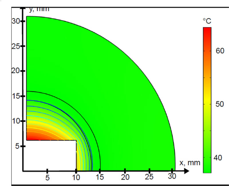 In Fig. (5) the 2D temperature profile at t=80 min is shown. The highest temperature values were found along the direction of the applied magnetic field. The power, dissipated by the MNPs embedded in the biomaterials, quickly diffuses to the surrounding fracture gap. This is due to the relatively high thermal conductivity of the hydroxyapatite material, with respect to the biological materials, as reported in Table. 3. However, the radial heating pattern presents a sudden decrease of about 3 mm away from the implant surface, tending to become homogeneous for distances higher than 20 mm. This trend resembles, from a qualitative point of view, the steady-state temperature profile, which is prescribed by Eq. (4) [10].