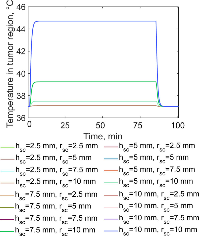 From Fig. (6) it can be noticed that the size of the implant strongly affects the average temperature in the tumour region. The quasi-steady state temperature is achieved after 13 min for each of the considered cases. For h sc=2.5 mm, the temperature is about 37.1 °C for any radius value of the implant. When the height is doubled, the temperature of the residual cells increases only up to 37.5 °C, with a very slight dependence on the radius (i.e. a variation of about 0.5 °C). When the magnetic cylinder has a height of 7.5 mm, the temperature increases to 39.24 °C ± 0.3 °C. Finally, if h sc=10 mm, the temperature in the target region is 44.71 °C, i.e. over the therapeutic threshold value of 42 °C for neoplastic cells. Such temperature level, which is maintained for 90 minutes, according to the literature, is sufficient to initiate the cascade of biological events, which could enhance the effectiveness of chemotherapy and radiotherapy [35, 36]. The average heating rates are similar to those found in previous studies [11, 14-17], but, from a quantitative point of view, are consistent with the experimental results found in other studies [26, 27]. Indeed, the magnetic hydroxyapatite implant, with properties reported