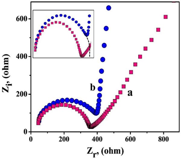 EIS method is advantageous for analyzing the surface behaviors and conductivity of the bare and modified electrodes. Fig. (2) displays the Nyquist plots for PNNMGPE (curve a) and BCPE (curve b). Here, we observed a semi-circular part in both the plots of bare and unmodified electrodes, signifying the charge transfer phenomena and their diameter represents the charge transfer resistance (Rct). The ‘curve a’ and ‘curve b’ represent PNNMGPE and BCPE, with the subsequent Rct values being 90.96 Ω and 355.00 Ω, correspondingly. Here, the modified PNNMGPE provides lesser Rct with high conductivity and faster electron transfer kinetics due to its modification effect [59].