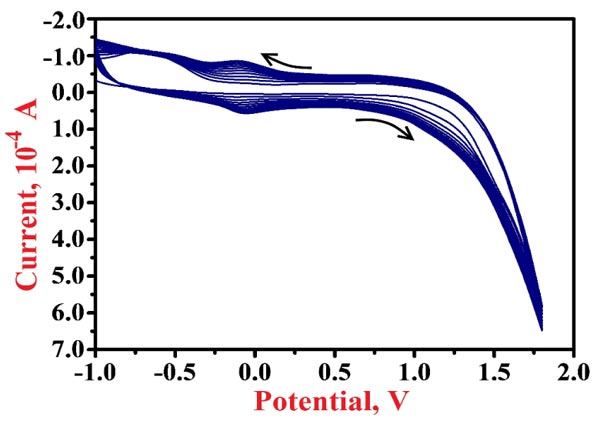 Electropolymerization of NN in 0.2 M PBS of 7.5 pH on the surface of BGPE was done by cycling 10 CV cycles with the potential range of -1.0 V to 1.8 V at 0.1 V/s scan rate. The enrichment of redox peak current of NN for each voltammetric probe was observed as shown in Fig. (3), which shows that the polymer layer is formed on the surface of the bare electrode. After the electrochemical polymerization, the modified electrode was rinsed with deionized water to eliminate the physically adsorbed materials.