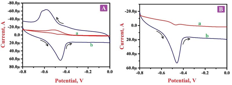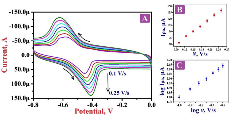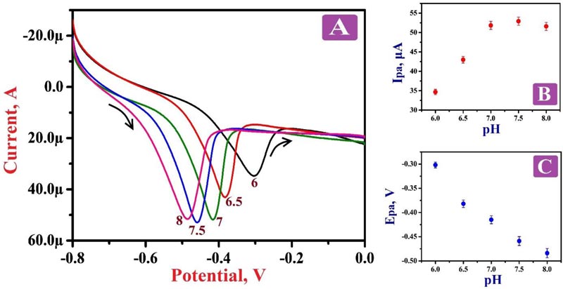 Electrochemical action was deliberated for 0.1 mM RF in 0.2 M PBS of pH 7.5 by CV and LSV approaches at BGPE and PNNMGPE under optimum experimental conditions. Fig. (5A) portrays the cyclic voltammograms (CVs) in the presence of RF molecule in PBS of 7.5 pH on the surface of BGPE (curve a) and PNNMGPE (curve b). Here, ‘curve a’ characterizes the electrochemical action of RF on an unmodified electrode surface, and discloses less sensitive redox peaks at the peak potential of -0.466 V and -0.517 V, respectively. Also, ‘curve b’ denotes the electrochemical behavior of RF at PNNMGPE surface, which delivers more higher anodic and cathodic peaks with the high current response at -0.451 V and -0.583 V than BGPE. From the attained outcomes, the BGPE shows less electron transfer rate and low peak currents with lower catalytic activity. However, PNNMGPE displays a high electron transfer rate and enhanced peak currents with high catalytic action for RF redox nature. The enhancement of redox peak currents at the modified sensor is due to RF interaction with the PNNMGPE surface. RF molecule displays both oxidation and reduction peaks with a change in potential (ΔEp) of 0.132 V, which specifies that the reaction mechanism of RF at PNNMGPE is quasi-reversible. These outcomes clearly clarify that the electrochemical nature of RF predominantly depends on the pH of PBS and PNNMGPE with adequate conductivity, fast electron transfer rate and suitable antifouling nature.