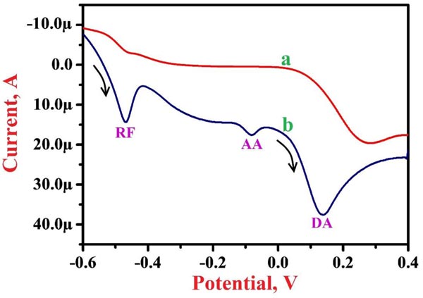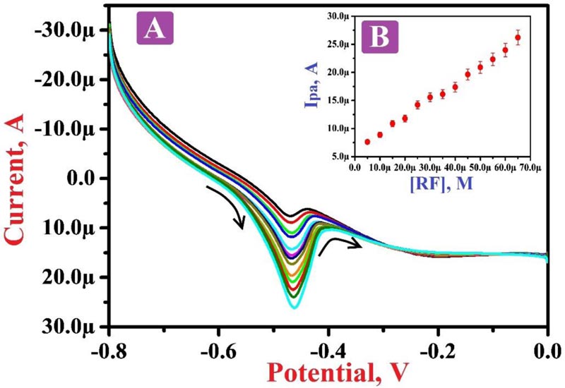 Poly niacin modified graphite paste electrode (PNNMGPE) provides more affinity towards RF detection with high sensitivity and selectivity over bare graphite paste electrode. RF calibration curve was obtained by LSV between 5.0 µM to 65.0 µM with 0.782 µM limit of detection (LOD) and 2.7608 µM limit of quantification (LOQ), respectively. Selective analysis of RF in the presence of ascorbic acid (AA) and dopamine (DA) was performed at PNNMGPE by the LSV method.