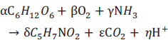When Eq. (5) is expressed in terms of chemical oxygen demand units, which represent the oxygen required for complete oxidation, only the factors associated with fructose, oxygen, and biomass are taken into consideration. Consequently, the terms NH3, CO2 and H+ are excluded from the equation, given their chemical oxygen demand is zero. Furthermore, the excluded terms arethen substituted into Eq. (5), resulting in the values of 192 g O2 mol-1 C6H12O6), 32 g mol-1 O2) and 160 g O2 mol-1 C5H7NO2, respectively. This modification transforms Eq. (5) into Eq. (6).