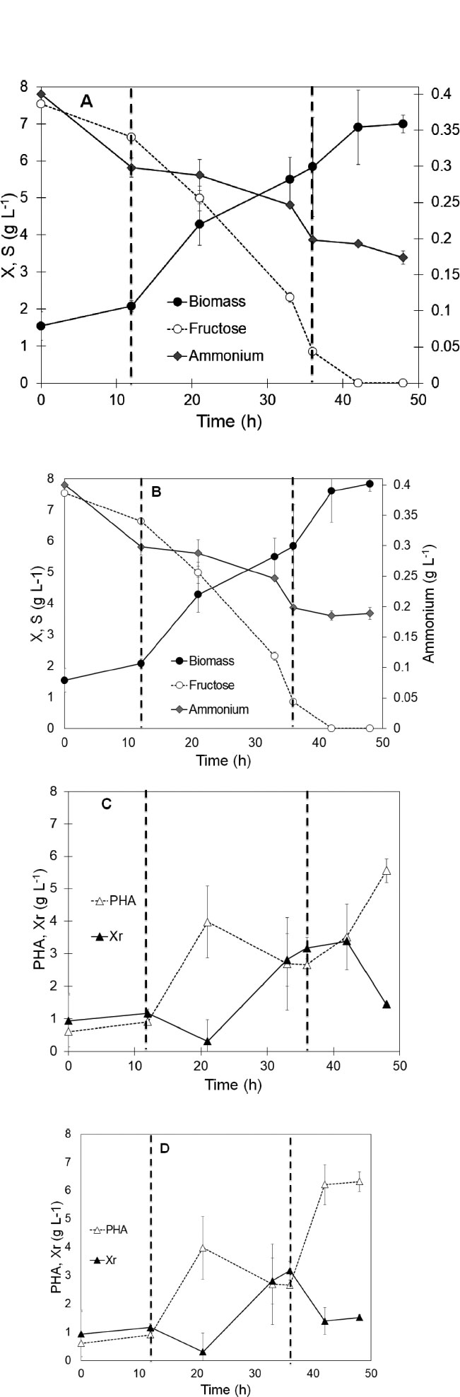 The strategy for PHA production in the four mini reactors follows a two-stage process. During stage one, C. necator was adapted under batch culture conditions at an initial C/N of 7.6 using fructose as the carbon source. Then, at stage two, when the fructose was exhausted, a new carbon source was added to the minireactors as follows: two of the minireactores were supplemented with vegetable oil (peanut oil), while the remaining mini- reactors were supplemented with sodium propionate. The amount of peanut oil and sodium propionate added to the mini reactors corresponded to a final concentration of 0.2% w/v.