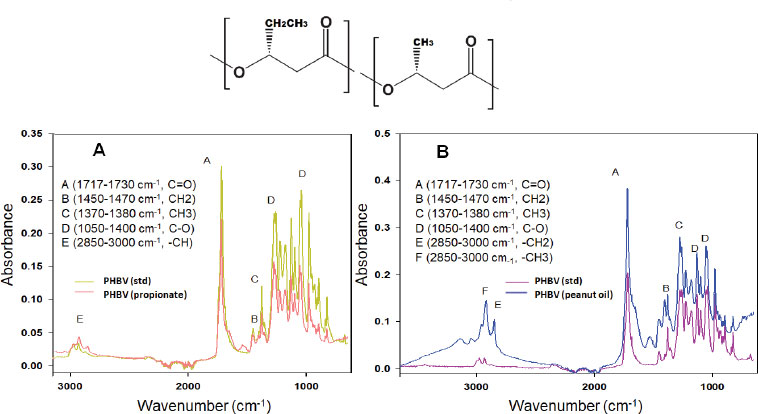 The spectra of Fig. (3) showed representative bands of the PHAs synthetized for C. necator. Where at 1720 cm-1, the presence of the carbonyl group of the ester was observed, at 1453 cm-1 the union of a CH2 with antisymmetric movement. In the region at 400 to 1500 cm-1, the presence of the PHA fingerprint was observed [2]. On the other hand, at 1278 cm-1 was observed a carbonyl group (C=O), confirms the ester bond, and at 2929 cm-1, the stretching group CH is attributed, which indicates the presence of HV in the PHA [21] (Fig. 2a). In addition to being compared with the commercial standard PHBV and the report in the literature of obtaining PHBV with sodium propionate [21]. Whereas, for PHA derived from peanut oil as substrate, we observed the fingerprint at 400 to 1500 cm-1, and at 1725 cm-1 is the stretching of the ester carbonyl group. Different peaks were observed in a wave number between 3049 to 3141 cm-1, these bands could be caused by water molecules.