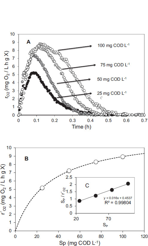 The DO curve (Fig. 1A) can be transformed into a rO2 curve with Eq. (1) (Fig. 1B). The value of the observed maximum oxygen uptake rate (r´O2max) for each pulse was determined from the average of the ten highest values of the respiration rate observed in the respirogram at a given value of SP. Then, the r´O2max values obtained were plotted against the SP values, and, will be discussed in the “Results and Discussion” section, the resulting graphs showed a clear Monod-type shape. Therefore, two important kinetic parameters were determined, namely, the substrate affinity constant (KS, mg L-1) and the maximum oxygen uptake rate (rO2 max, mg O2 L-1 h-1), following a Monod model for the C. necator growth in the presence of a given substrate concentration (SP) (Eq. 3).