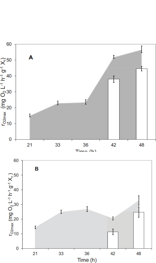Fig. (5) illustrates the specific values of rO2max obtained in the microreactors. The micro respirometric characteri- zation of the samples obtained at hours 21, 33 and 36 were done using fructose as substrate. A significant increase was observed between hours 21 and 33, corresponding to the increase in biomass activity. During hours 33 and 36, the average rO2max values were 23.02 ± 1.15 mg O2 L-1 h-1 g-1 and 23.66 ± 1.52 mg O2 L-1 h-1 g-1 X, respectively. These values were not significantly different and corresponded to the first stage of PHA production when there was still fructose in the liquid media. Globally, there is a lack of literature reports about respirometry applied for the characterization of cultures of C. necator; hence, this is the first time that this technique has been applied to a culture of this type, and there is no data available to make an adequate comparison of the values.