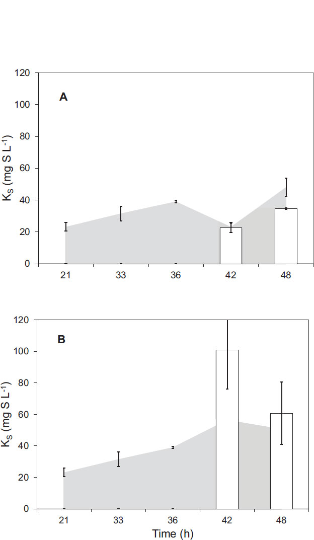 In regard to the second kinetic parameter, KS, Fig. (6) shows the results obtained for its estimation during micro respirometric experiments. The results obtained with samples from the first stage of PHA production showed specific KS values of 31.55 ± 4.58 mg L-1 g-1 and 39.08 ± 0.70 mg L-1 g-1 for hours 33 and 36, respectively. This value was similar to the results obtained from a study [23], with a similar respirometry protocol applied to a culture of Pseudomonas putida F1 with glucose as the sole carbon source. The results obtained in samples supplemented with peanut oil corresponding to the second stage of the process showed a slight reduction in the KS values at hour 42 and then an increase in the value at hour 48. The case of the samples taken from the mini reactors during stage two and supplemented with sodium propionate showed an important increase in the obtained values of KS that indicates that the microorganism lost affinity for fructose during the carbon source change. The results obtained with the injection of pulses of sodium propionate and peanut oil showed that the microorganisms were more related to peanut oil than to sodium propionate. Specifically, the KS value for sodium propionate was 158% higher at hour 42 than the KS value for fructose. At the same time, the KS value for peanut oil was only 9% higher than the KS value for fructose at the same time. These results indicated that C. necactor had a similar affinity for fructose and for peanut oil and a low affinity for sodium propionate.