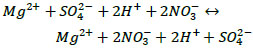 As the equilibrium condition is ΔG = 0, the ΔG value of reaction (1) corresponds to a system state close to the equilibrium and does not indicate a thermodynamic prohibition of the reaction itself. ΔG values for reaction (2), equal to ≈ +30 kJ/mole, as shown in Fig. (7), indicate a thermodynamic impossibility of an interaction between magnesium sulphate and nitric acid. However, at the same time, low positive values of Gibbs energy characterise, as for reaction (1), a possibility of a reaction (2) with dissolution of a small part of the magnesium salt until an equilibrium is established in the system in regards to magnesium.