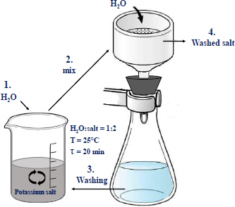 The monolithic cores were taken from the potash ore warehouse of Batys Potassium National Corporation in Aktobe city. To accomplish the main tasks set in the study, chemical and instrumental methods of research and analysis were used. To wash the ore from sodium salts, the incomplete dissolution method was used, in which crushed raw materials are washed with water taken in an amount insufficient to dissolve potassium chloride, but sufficient to dissolve sodium salts for a certain time [14]. The scheme of salt enrichment is shown in Fig. (1). The method is based on the treatment of milled ore with water, used in a limited quantity to exclude the dissolution of potassium and magnesium salts. The process parameters are shown in Fig. (1). At the end of the process, the suspension was separated into liquid and solid phases via simple filtration through a paper filter. For double washing mode, the separated filtrate is used for washing the ore twice, first with the first filtrate and then with water (shown in the scheme as 3. Washing). Both components were then analysed for the content of potassium and sodium oxides.