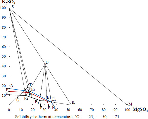 In determining the type and amount of crystallising salt during solution evaporation, the content of nitrate ions was not taken into account. Chemical analysis determined the composition of the solution obtained in optimal decomposition mode, namely: 4,51% K2O, 2,54% MgО, 10,9% SO42- and 2,03% N. The evaporation process is depicted in the diagram as the evaporation beam OT. At a temperature of 75°C, the system is in the field ASE1 of potassium sulphate crystallisation. To crystallise this salt, about 60% of the water should be evaporated from the extract, which is shown by the GT segment. In these conditions, a pure salt of potassium-magnesium sulphate was obtained, since the figurative point of system composition was in the field of joint crystallization of potassium sulphate and a double salt. This salt composition is shown in Table 6. Its content practically corresponds to the crystalline hydrate composition indicated by the XRD analysis in Fig. (11a).
